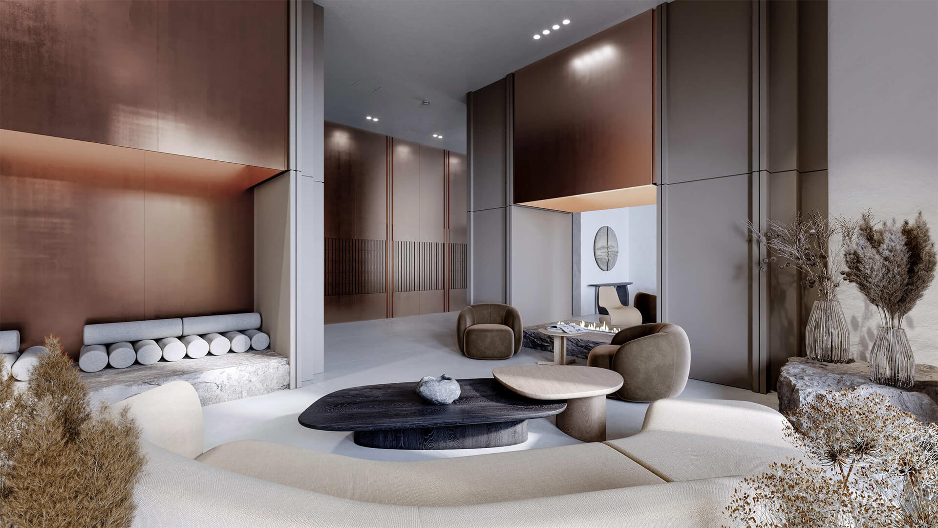 Особое внимание уделено пропорциям и деталям: элементы фасадов имеют лаконичные, но выразительные формы, в отделке использованы металлы с фактурной патиной, архитектурный бетон и терракотовая плитка. Все решения направлены на то, чтобы создать не просто жилой дом, а эстетичную городскую среду, которая будет актуальна десятилетиями. Архитектура «Среды на Кутузовском» — это современная интерпретация элитного городского стиля, отражающая ценности эстетики, приватности и технологичности.