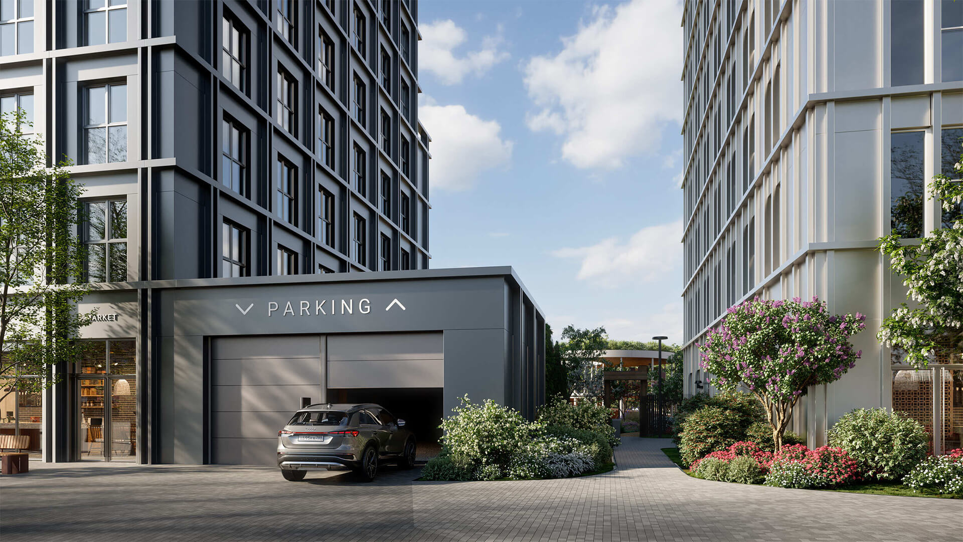 Сквозные проходы и галереи на первом этаже объединяют жилые корпуса с коммерческими и общественными зонами. Резиденты могут попасть в продуктовые магазины, кофейни, химчистки и другие сервисы, не выходя на улицу — что особенно удобно в зимнее время. В каждой входной группе предусмотрены зоны ожидания и отдыха, ресепшен с консьерж-сервисом, помещения для хранения колясок и велосипедов. Видеонаблюдение, доступ по карте, лифты бизнес-класса — всё это формирует высокий уровень приватности и безопасности.