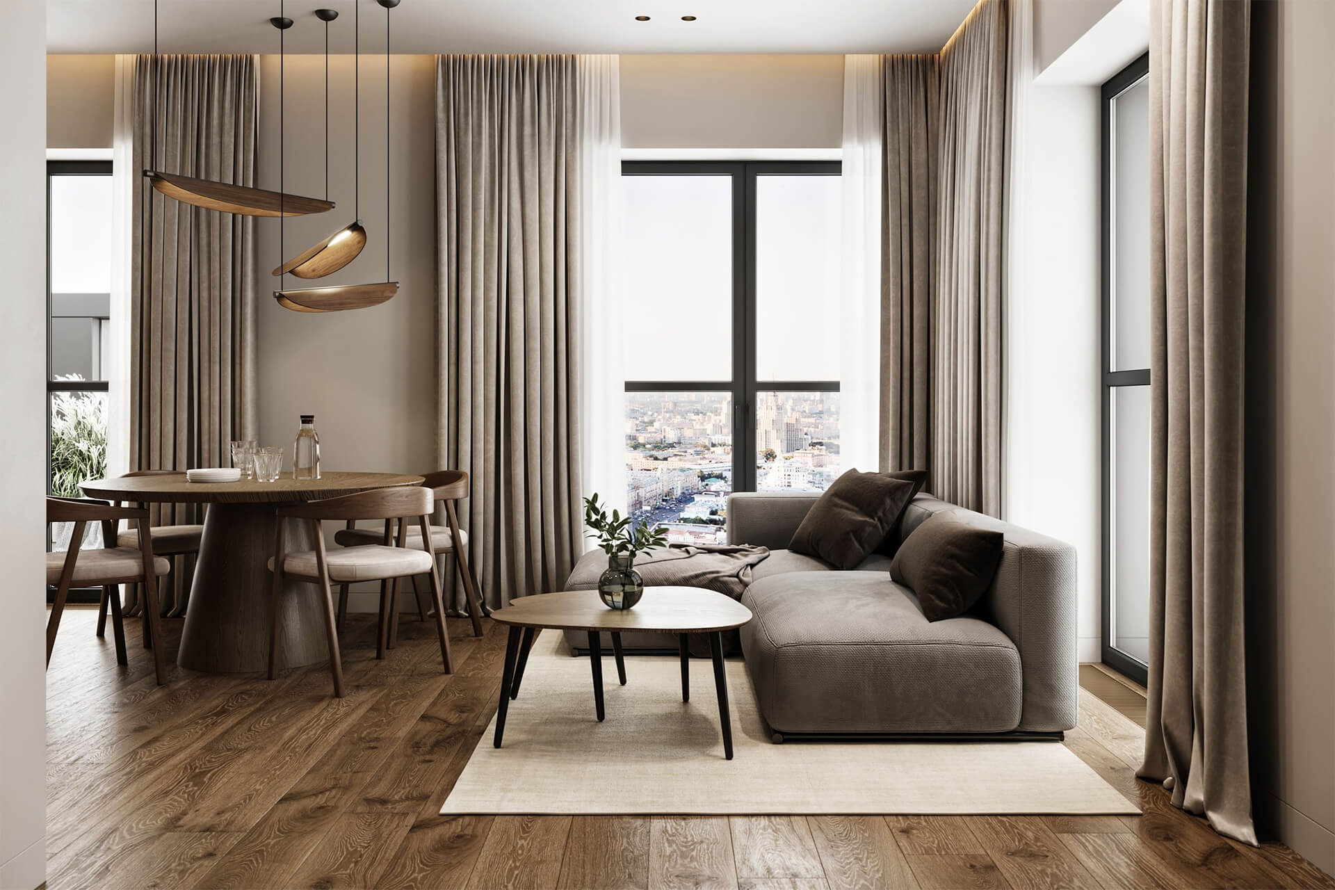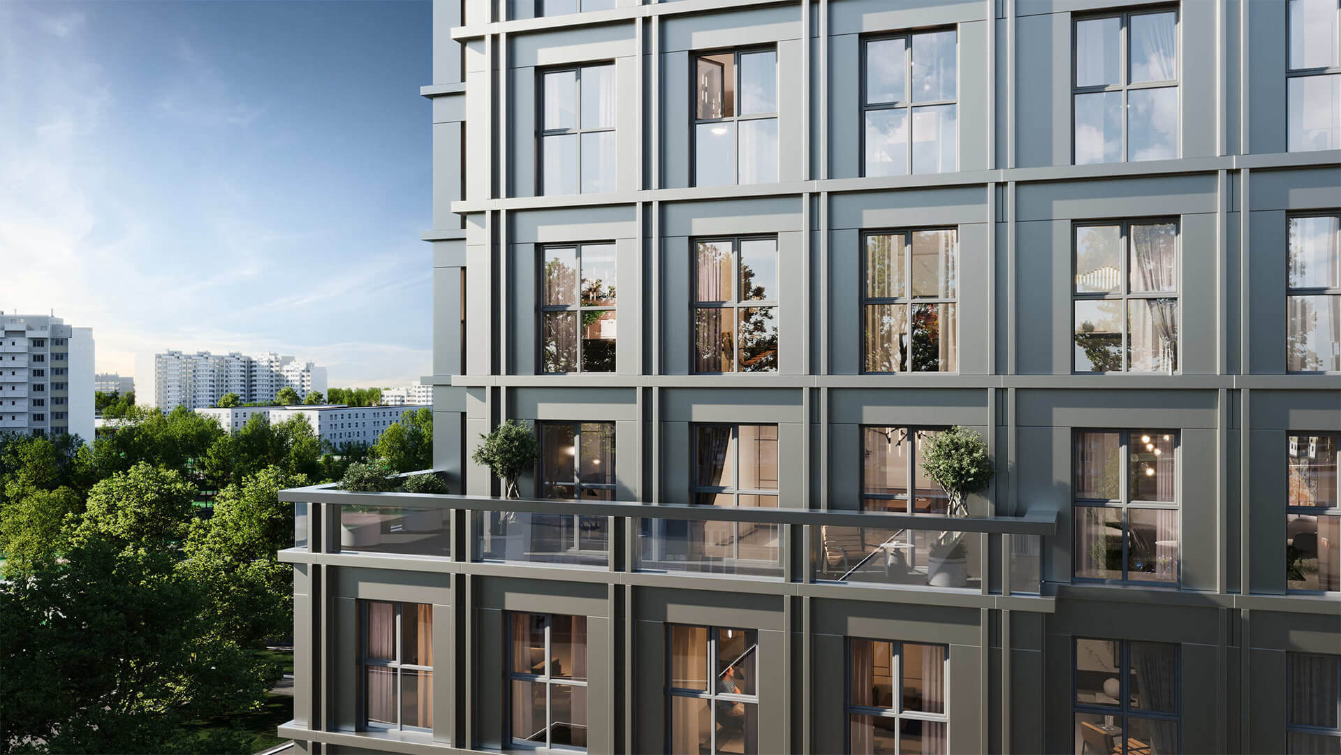 Панорамные окна с минималистичными рамами позволяют наполнять квартиры естественным светом и открывают живописные виды на город, реку и зелёные массивы. Террасы, французские балконы и лоджии включены в проектную геометрию фасадов, тем самым формируя живую структуру и давая возможность обитателям ощущать связь с внешним миром. Первый этаж каждого корпуса выполнен в виде сквозных галерей — это оживлённые городские аркады с кафе, магазинами и лобби, создающие атмосферу открытого квартала с европейским духом. Проектная высота потолков и свободные планировочные решения позволяют адаптировать жильё под индивидуальные запросы.