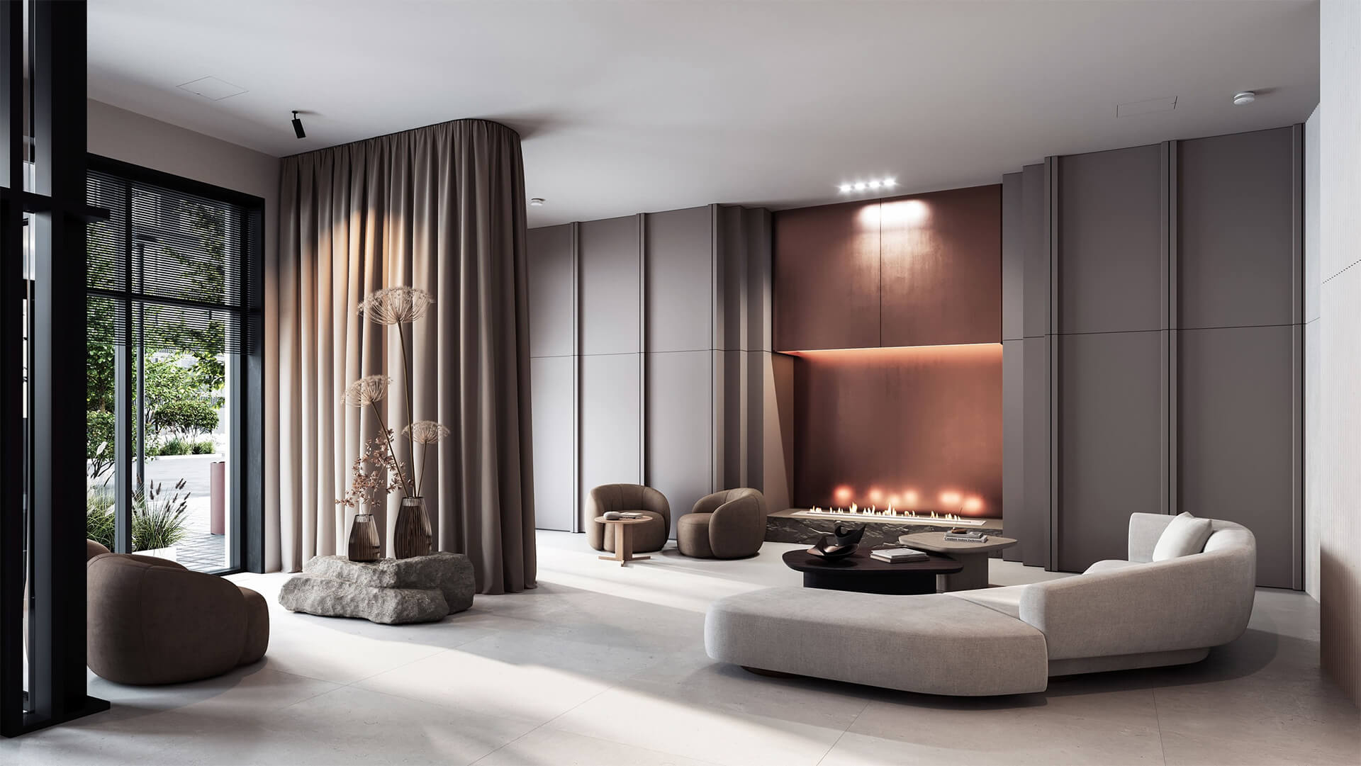 Особое внимание уделено пропорциям и деталям: элементы фасадов имеют лаконичные, но выразительные формы, в отделке использованы металлы с фактурной патиной, архитектурный бетон и терракотовая плитка. Все решения направлены на то, чтобы создать не просто жилой дом, а эстетичную городскую среду, которая будет актуальна десятилетиями. Архитектура «Среды на Кутузовском» — это современная интерпретация элитного городского стиля, отражающая ценности эстетики, приватности и технологичности.